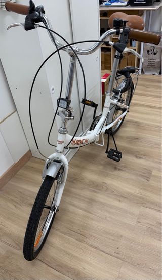 Bicicleta plegable NORDIC Bike en color blanco. Ideal para desplazamientos urbanos y fácil de almacenar. - Cuadro de aluminio. - Ruedas de 16 pulgadas. - Cambio SHIMANO. - Sillín marrón. - Guardabarros delantero y trasero.
