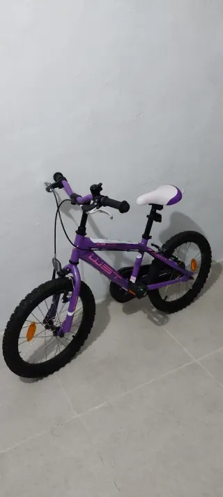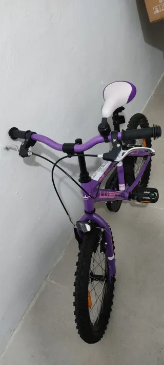 Bicicleta infantil de 16 pulgadas en color morado con toques blancos. Ideal para los más pequeños. - Ruedas de 16 pulgadas. - Color principal morado. - Detalles en color blanco. -sillín regulable - sería algo negociable.