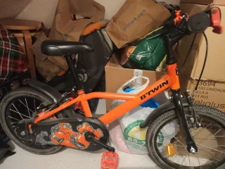 Bicicleta infantil B'TWIN de color naranja. - Ruedas de 16 pulgadas. - Diseño con personaje de robot. - Frenos delanteros y traseros. Muy poco uso