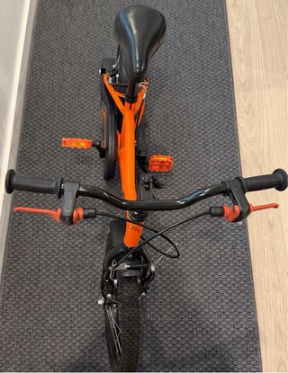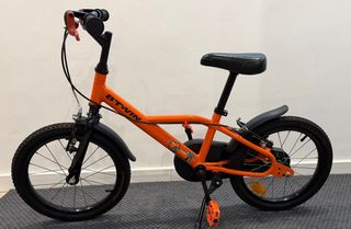 Bicicleta infantil de la marca Btwin, en color naranja. Ruedas de 16 pulgadas. Frenos delantero y trasero. Sillín ajustable en altura. Dispone de ruedines. Está nueva,sólo la usó 1 vez,porque realmente no le gusta la bici al niño,tiene el desgaste que se ve en la foto 4ª de tenerla atada con una cuerda,pero está perfecta. La podéis probar sin compromiso.Costó 140,la dejo en 70€