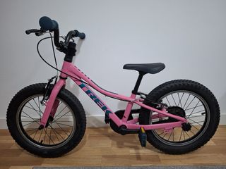 Bicicleta infantil marca Trek, tamaño 16 pulgadas. - Color rosa vibrante. - Ruedas anchas para mayor estabilidad. - Diseño moderno y llamativo.