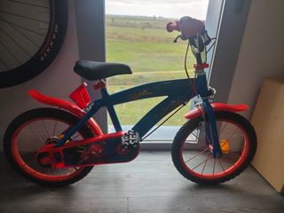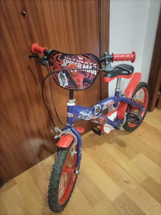 Bicicleta infantil con diseño de Spiderman, ideal para niños de 5 a 6 años. Se encuentra en buen estado. - Ruedas de 16 pulgadas. - Frenos de mano. - Sillín y manillar ajustables. - Guardabarros delantero y trasero. Es la que usaba Spiderman de shiquitito.