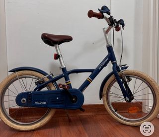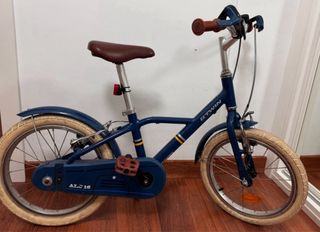 Bicicleta infantil de Decathlon, modelo ALIJ 16 pulgadas, en color azul. Ideal para niños de 3 a 6 años. - Ruedas de 16 pulgadas. - Sillín y puños marrones. - Guardabarros delantero y trasero. - Cubrecadenas para mayor seguridad.