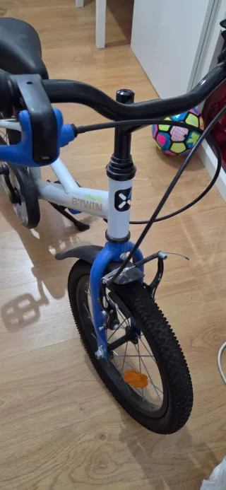Bicicleta infantil de la marca B'TWIN, ideal para los más pequeños. - Color blanco y azul. - Ruedas de 16 pulgadas. - Frenos delanteros y traseros.