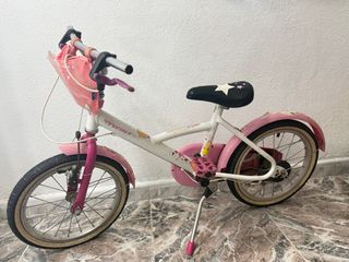 Bicicleta infantil en color blanco y rosa, ideal para niños de 4 a 6 años. Cuenta con cesta delantera y guardabarros. - Ruedas de 16 pulgadas. - Sillín ajustable. - Pedales con reflectores. -Hay que llenarle las ruedas antes de usar -Está usada y con pegatinas