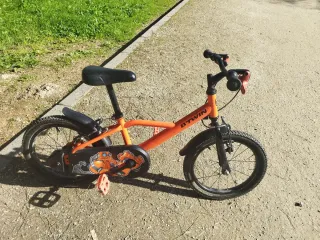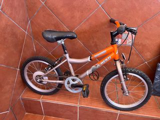 Bicicleta infantil de la marca B'Twin, ideal para los más pequeños. - Color naranja vibrante. - Diseño llamativo en el protector de cadena. - Ruedas de 16 pulgadas. Habría que cambiar una de las gomas de los puños.