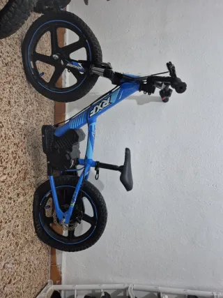 Bicicleta eléctrica para niños con diseño deportivo. - Color azul con detalles gráficos. - Ruedas de 16 pulgadas. - Frenos de disco. Están las 2 ruedas pinchadas y no tiene cargador por lo demás esta nueva 2 veces usada