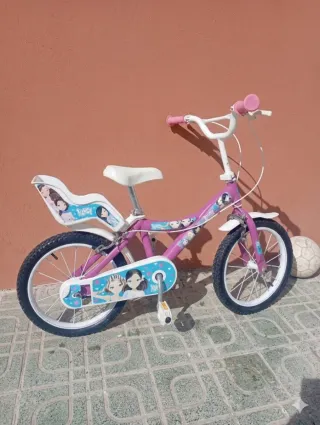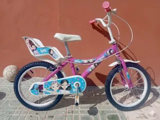 Bicicleta infantil de la marca Nancy, ideal para niñas. - Ruedas de 16 pulgadas. - Diseño con personajes. - Asiento trasero para muñecas. Con pequeña rotura. Está usaba pero se conserva bien.