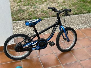 Bicicleta infantil B-PRO JR16 con ruedas de 16 pulgadas. Ideal para niños aproximadamente entre 4 y 7 años. Características: • Frenos delantero y trasero • Pata de cabra para aparcar • Protector de cadena • Muy manejable y ligera para aprender La bicicleta funciona perfectamente. Tiene marcas normales de uso (especialmente en el sillín), pero todo está en buen estado. Lista para usar