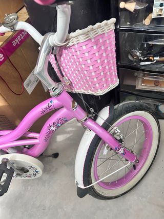 Bicicleta infantil de color rosa, ideal para los más pequeños. Cuenta con una práctica cesta delantera. - Color rosa vibrante. - Cesta de mimbre rosa. - Ruedas de 16 pulgadas.