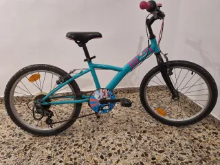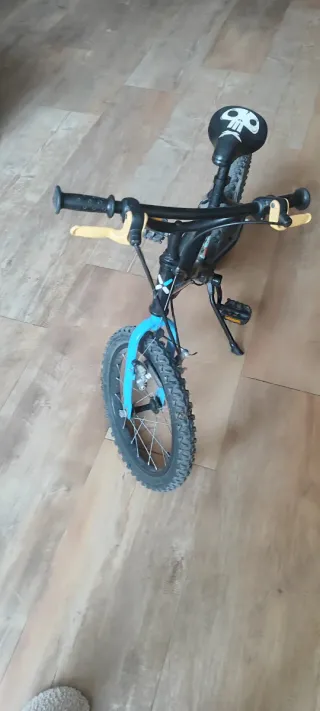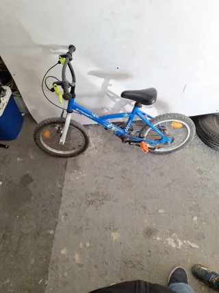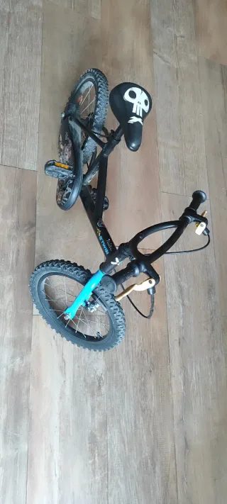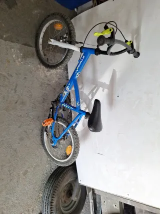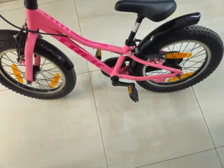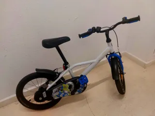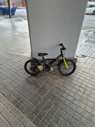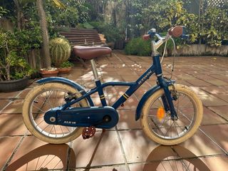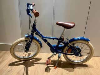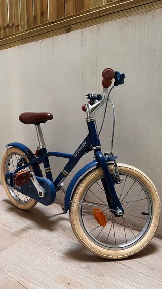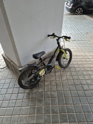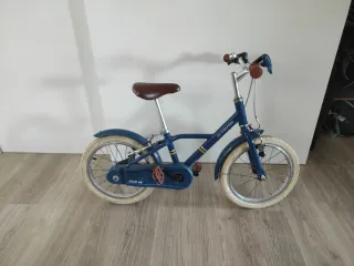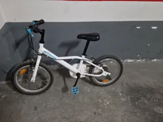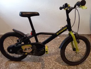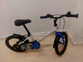 Bicicleta infantil de la marca BTWIN, ideal para los más pequeños. Lo ha dado todo. - Pata de cabra incluida. - Cuadro de acero. - Ruedas de 16 pulgadas. - Frenos delanteros y traseros. - Sillín ajustable en altura.