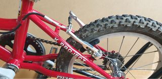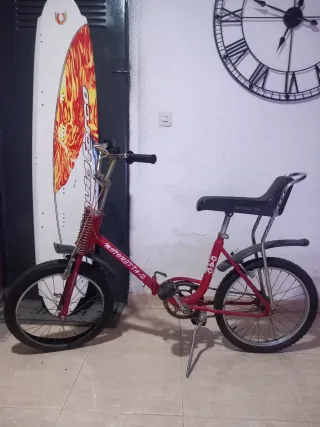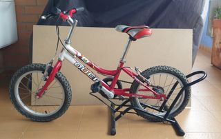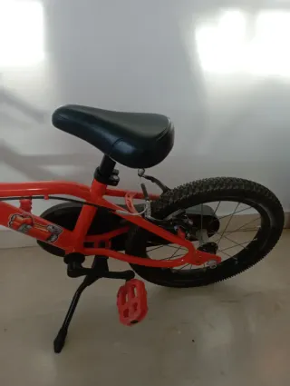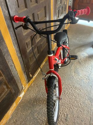 Bicicleta infantil de color rojo, ideal para los más pequeños. Se encuentra en buen estado. - Ruedas de 16 pulgadas. - Diseño deportivo con gráficos. - Frenos de mano.