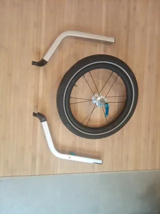 Rueda de accesoria para correr con el carrito Thule Chariot 1. Se incluye la rueda y las dos barras de soporte. - Rueda de 16 pulgadas. - Barras de soporte plateadas. Algunas marcas de uso en las barras