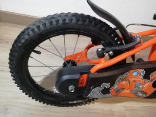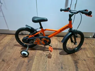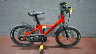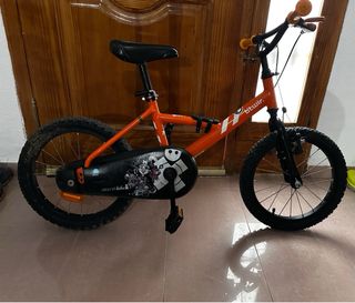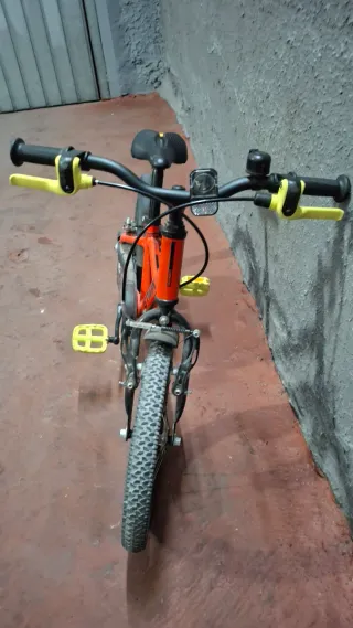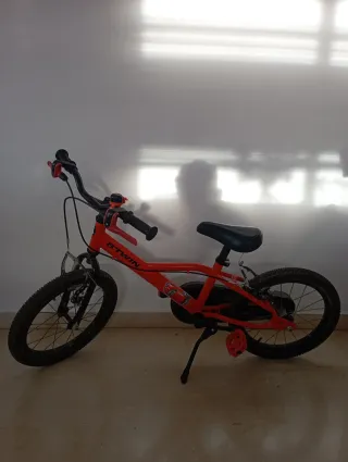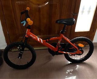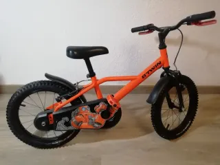 Bicicleta infantil de color naranja con ruedas de 16 pulgadas. Ideal para iniciarse. Buen estado en general - Marca Btwin. - Ruedas con banda de rodadura marcada. - Sillín negro. - Puños de manillar naranjas.