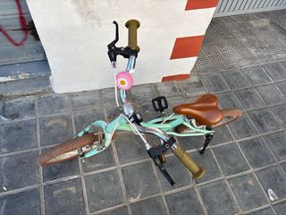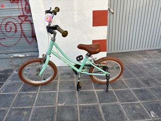 Bicicleta infantil 16pulgadas en color verde mint, ideal para niñas de 2 a 6 años. Perfecta para iniciarse en el mundo de las dos ruedas. INCLUYE CESTA DE MIMBRE PARA MANILLAR EN PERFECTO ESTADO Y LLANTAS ORIGINALES CON SISTEMA FRENADO DE PEDALES - Ruedines de apoyo incluidos. - Sillín y manillar ajustables. - Diseño ligero y manejable.