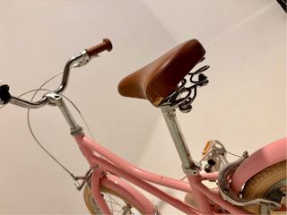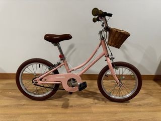 Bicicleta infantil de estilo vintage en color rosa, con un tamaño de rueda de 16 pulgadas. Perfecta para niños de 5 - 7 años. - Diseño clásico y elegante. - Incluye una práctica cesta delantera de mimbre. - Sillín y puños en tono marrón a juego.