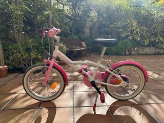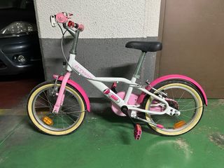 Bicicleta infantil BTWIN en color rosa, ideal para iniciarse en el ciclismo. - Cuadro de acero. - Ruedas de 16 pulgadas. - Frenos V-brake. - Guardabarros delantero y trasero. - Timbre incluido.