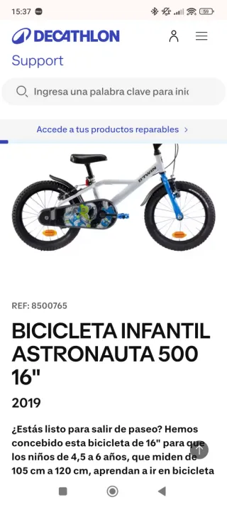 Bicicleta infantil Btwin Astronauta 500 de 16 pulgadas, modelo 2019. Diseñada para niños de 4,5 a 6 años que miden entre 105 cm y 120 cm. - Ruedas de 16 pulgadas. - Diseño temático de astronauta. - Ideal para aprender a montar en bicicleta.