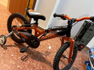 Bicicleta infantil de la marca Monty, modelo KY3, con ruedas de 16 pulgadas. Ideal para los más pequeños. - Cuadro de aluminio. - Ruedines de apoyo incluidos. - Color naranja y negro.