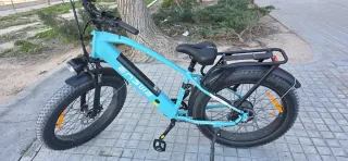 Bicicleta eléctrica de la marca ENGWE, modelo E26. Diseñada para ofrecer una experiencia de ciclismo cómoda y versátil. - Color azul vibrante. - Ruedas anchas para mayor estabilidad. - Portabultos trasero integrado. - Motor: 250W con un par de 70 Nm para pendientes pronunciadas. - Batería: Capacidad de 768 Wh (48V 16Ah), ofreciendo una autonomía de hasta 140 km en modo asistencia. -Ruedas: Neumáticos anchos tipo "fat tire" de 26x4.0 pulgadas para diversos terrenos. -Velocidad: Limitada a 25 km/h según la normativa europea. Pero tiene un método para quitar el limitate y llega 65km /h - Incluye frenos de disco