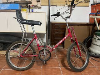 Bicicleta clásica Motoretta de la marca G.A.C. con un diseño deportivo y llamativo. - Color rojo vibrante. - Asiento largo tipo banana con logo G.A.C. - Ruedas de 16 pulgadas. - En perfecto estado.