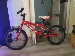 Bicicleta infantil B'Twin en color rojo, ideal para niños pequeños. Está en buen estado, aunque muestra señales normales de uso. - Modelo B'Twin. - Color rojo. - Ruedas de 16 pulgadas. - Frenos de mano.