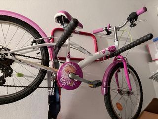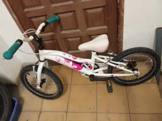Bicicleta infantil de la marca Btwin, ideal para niñas. Si necesitas más fotos o medidas pídemelo. - Color blanco y rosa. - Ruedas de 16 pulgadas. - Diseño con personaje. - Guardabarros delantero y trasero.