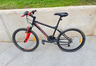 Bicicleta B-twin Rockrider en color negro y rojo. Ideal para disfrutar de tus rutas. - Cuadro robusto. - Ruedas de 24 pulgadas. - Suspensión delantera. - 18 marchas. - Frenos V- brake.