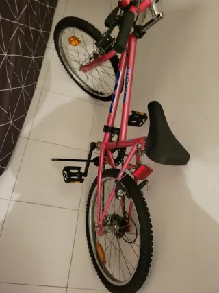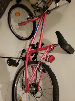 Bicicleta de montaña en color rosa, con detalles en azul y blanco. - Cuadro de metal. - Ruedas de 26 pulgadas. - Frenos delanteros y traseros. - Reflectores en ruedas y parte trasera No estoy segura si está ya 16 o talla 18.