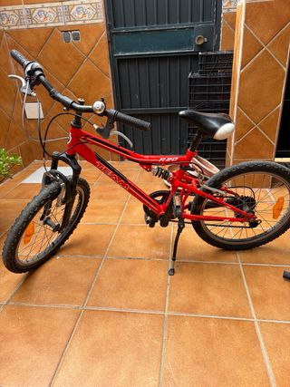 Bicicleta de montaña de color rojo con suspensión delantera y trasera. - Cuadro de metal. - Ruedas de 20 pulgadas. - Frenos de mano.
