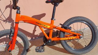 Bicicleta infantil Monty 103 de BMX en color naranja. Ruedas de 16 pulgadas. - Cuadro de aluminio. Su ligereza facilita pedaladas estables. Resiste y ágil. - Ruedines incluidos. - Cuadro Alloy 6061-T6. - Horquilla y manillar Hi-ten - Dirección 1" ball bearing - Potencia Alloy, L40x20o, D22,2mm - Frenos V-Brake - grupo cambio pedalier steel , 102mm, 28T - Sillín Selle Royal - Reflectores y puños rubber - Está como nueva, se ha usado muy poco. Sin arañazos ni roces