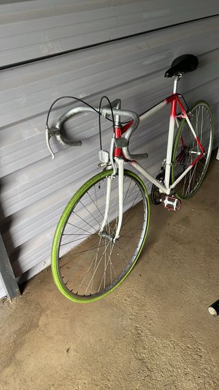 Bicicleta de carretera con un diseño llamativo en rojo y blanco. Ideal para disfrutar del ciclismo. - Cuadro de bicicleta de carretera. - Ruedas de color verde brillante. - Pedales rojos. Las bicicletas se encuentran en buen estado