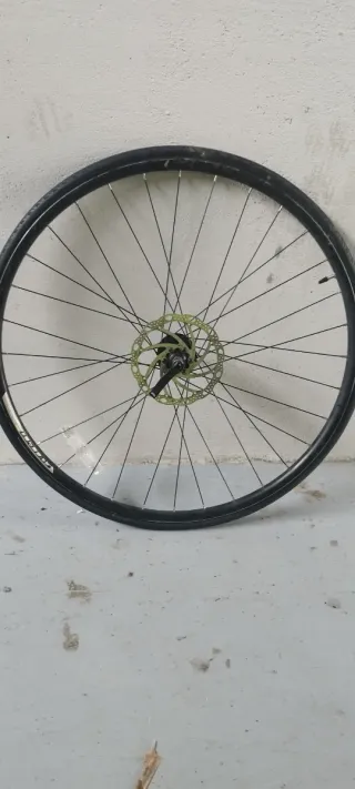 Rueda 700c delantera de eje pasante 12x100 para bici de carretera, y 18 mm de ancho interno; usada para cicloturismo exclusivamente; modelo DT Swiss R24db SPLine. Con disco centerlook Shimano 160 mm y neumático Schwalbe Marathon 700x35c. Regalo cierre rápido y su adaptador. Buen estado. Importante: SOLO VENTA EN PERSONA