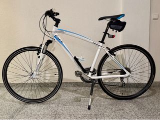 Bicicleta de montaña BH de color blanco con detalles azules. - Cuadro de aluminio. - Horquilla delantera con suspensión. - Frenos de disco. - Cambio Shimano. - Ruedas de 29 pulgadas. - Sillín azul. - Bolsa de sillín negra. - Portabidón.