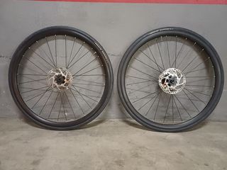 Juego de ruedas de carretera completas desmontadas de una Orbea Orca nueva. Solo usadas para probar la bici y montar unas de carbono. - Llanta de aluminio perfil 30 tubeless ready con buje Shimano. - Discos 160 y cassette Shimano 105 12v (11-34). - Cubiertas Vittoria Zaffiro 28c.