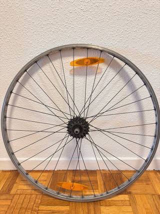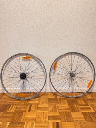 Pareja de ruedas de bicicleta de carretera. Ideales para proyectos o repuestos. Están viejas pero todavía se defienden. La trasera lleva casette de 6 cambios. Vendo porque he restaurado la bici y le he puesto otras ruedas.
