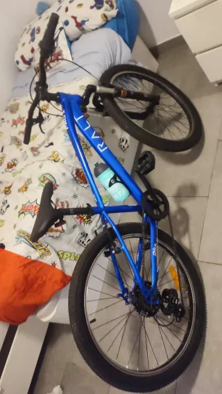 Bicicleta infantil de color azul, en perfecto estado ya que solo ha sido utilizada dos veces. - Cuadro de aluminio. - Ruedas de 24 pulgadas. - Frenos de disco. - Incluye portabidón.