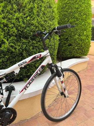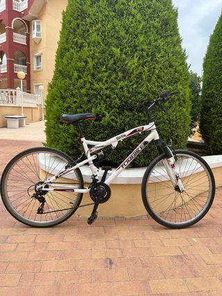 Bicicleta EMT Climber de montaña, ideal para paseos y aventuras. De 26 pulgadas talla S o m. - Cuadro blanco con detalles negros. - Suspensión delantera y trasera. - Frenos mecanicos recien ajustados. - Cambio en ambos puños 21 velocidades - Ruedas de 26 pulgadas. En perfecto estado.