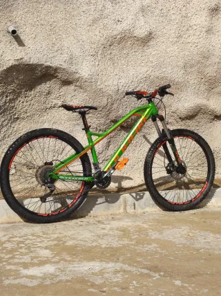 Prácticamente nueva, usada solo 3 veces. Bicicleta de montaña talla S, aluminio ligero 13,9 kg, muy cómoda y confortable, ruedas 27,5” Cambios Shimano, suaves y precisos. regalo casco negro a juego talla 53/57, luz trasera y porta-bidón, lista para usar desde el primer día. Componentes originales (no puedo decir que es nueva a estrenar, porque me he montado en ella tres veces, no tiene de recorrido ni tres horas juntas) aire en las ruedas,frenos y cambios revisados. Estado: excelente, solo una pequeña marca en una pegatina por un roce que se puede despegar de la bici sin problema, debajo no tiene marca, aun asi (ya estás descontado del precio) Excelente regalo de reyes unisex, para niñ@s grandes o adultos no muy altos