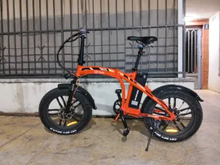 Vendo o cambio por moto es una Bicicleta eléctrica plegable de color naranja, ideal para todo tipo de terrenos. - Ruedas anchas CST BFT 20x4.0. - Frenos de disco. - Batería extraíble. - Marca: Youin RK III.
