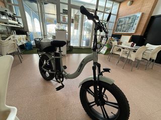 Bicicleta eléctrica plegable de color negro, ideal para desplazamientos urbanos o escapadas. - Diseño plegable para fácil almacenamiento y transporte. - Ruedas anchas para mayor estabilidad. - Portaequipajes trasero integrado. - Batería extraíble. Posibilidad de probarla Precio tratable
