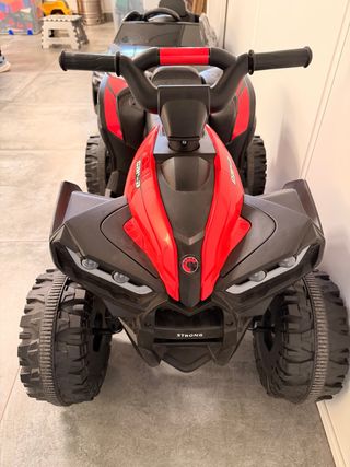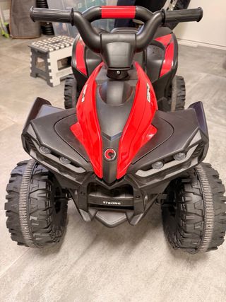 Quad eléctrico infantil de color rojo, perfecto para los más pequeños. - Diseño deportivo y llamativo. - Ruedas todoterreno para mayor agarre. - Volante ergonómico para un fácil manejo.