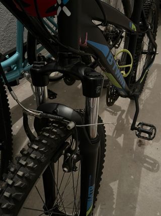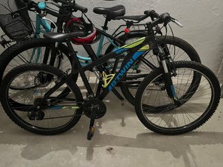 Bicicleta Btwin de montaña con un diseño deportivo en negro, azul y detalles verde lima. - Cuadro Btwin. - Ruedas de 26 pulgadas. - Frenos de disco. - Cambio Shimano. ⚠️NO SE ENVIA⚠️ Hay algunos desperfectos como los mangos pero se pueden cambiar y son baratos y algunas manchas que se cayeron pintando. Se uso un par de veces y se cambio por una talla mas grande. Se puede ver en persona si se quiere