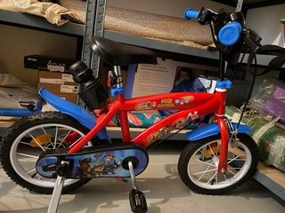 Bicicleta infantil con diseño de Patrulla Canina. Está prácticamente nueva. - Color principal: rojo. - Ruedas blancas. - Guardabarros azules.