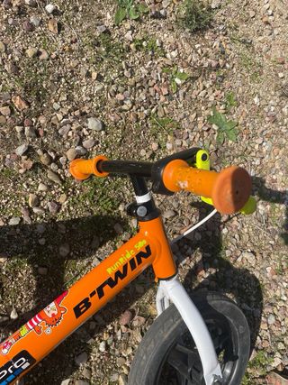 Bicicleta de aprendizaje B'TWIN en color naranja. Ideal para que los más pequeños aprendan a mantener el equilibrio. - Marco de metal. - Ruedas negras. - Asiento negro ajustable. tiene la goma de la empuñadura izquierda un poco rajada (foto)