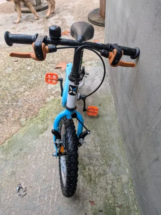 Bicicleta infantil de color azul, ideal para los más pequeños. - Marca Decathlon. - Diseño divertido con personajes. - Ruedas de 16 pulgadas.