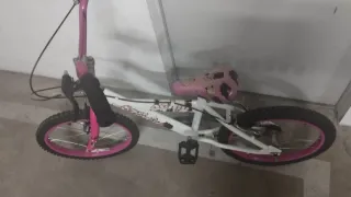 Bicicleta infantil en buen estado, ideal para los más pequeños. Se vende porque se ha quedado pequeña. - Cuadro de color blanco con detalles en rosa. - Ruedas con llantas rosas. - Sillín con estampado de manchas rosas y negras.