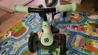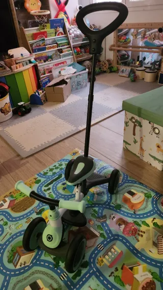 Bicicleta evolutiva Globber, ideal para los primeros años. - Color verde menta y negro. - Mango de empuje para padres. - Reposapiés. - Ruedas de goma. Prácticamente nueva.