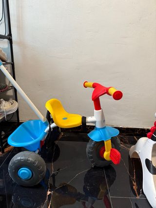 Triciclo infantil con asiento amarillo y cesta azul. - Manillar rojo con puños amarillos. - Ruedas negras con detalles azules. - Barra de empuje para padres.