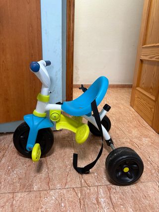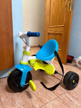Triciclo infantil con diseño divertido en colores azul y verde. - Asiento cómodo. - Ruedas resistentes. - Cinturon de seguridad.